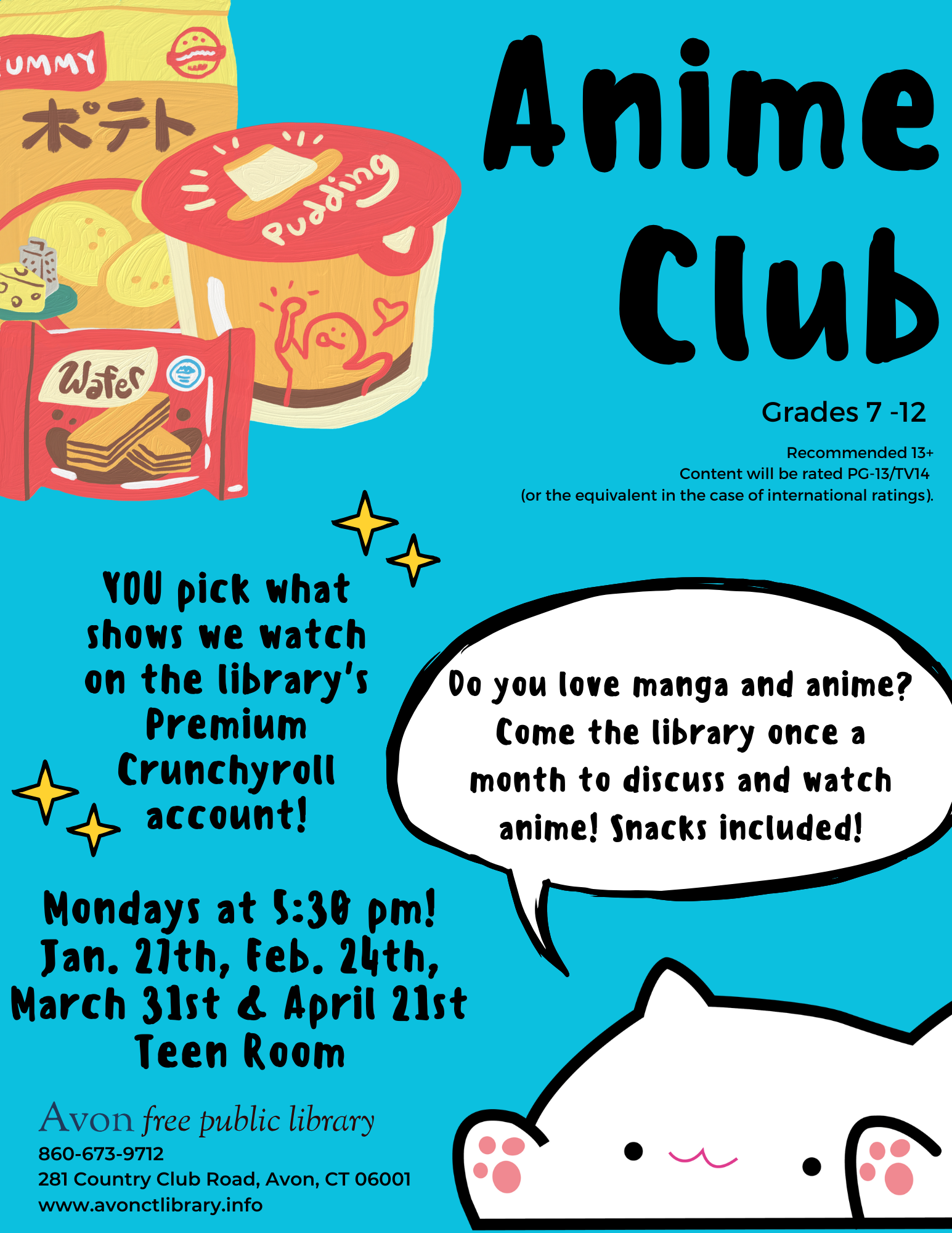 Come to the library to discuss + watch anime and have snacks.