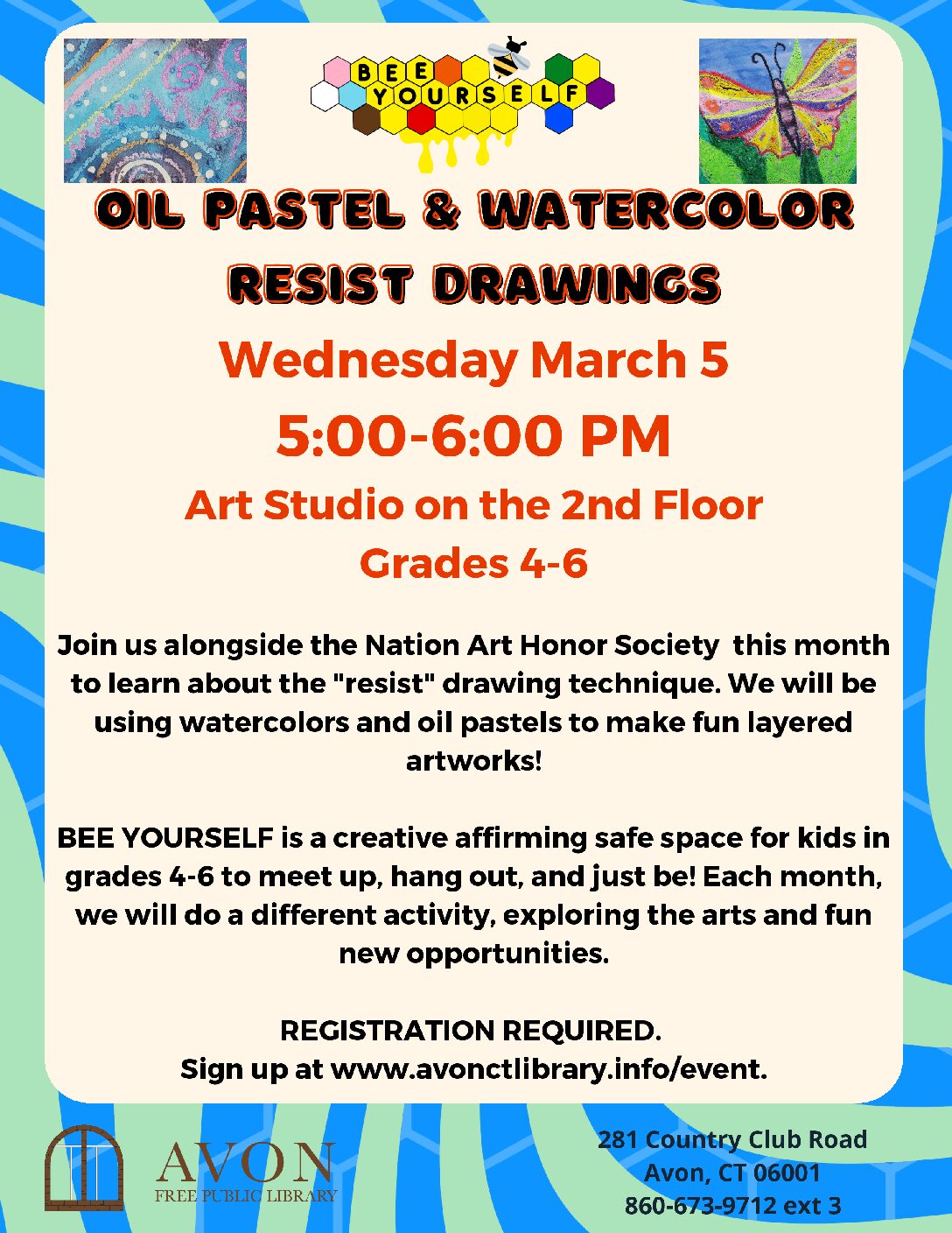 Why?: BEE YOURSELF is a creative affirming safe space for friends in grades 4-6 to meet up, hang out, and just be. Each month, we will do a different activity, exploring the arts and fun new opportunities. This month, we will be joined by NAHS members to teach us the resist technique using watercolors and oil pastels!