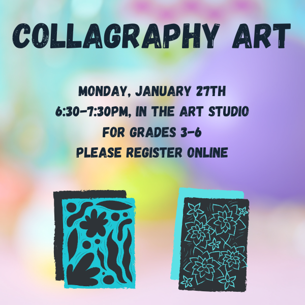 Come and explore the art of collagraphy. Collagraphy is a printmaking process where materials are glued or sealed to a board to create a “plate.” This plate is then used to imprint the design onto paper. We will provide materials to create handmade prints with your own designs. Experiment with one layer & color first, then try more colors or two layers. We will be using paint so wear messy clothes!
