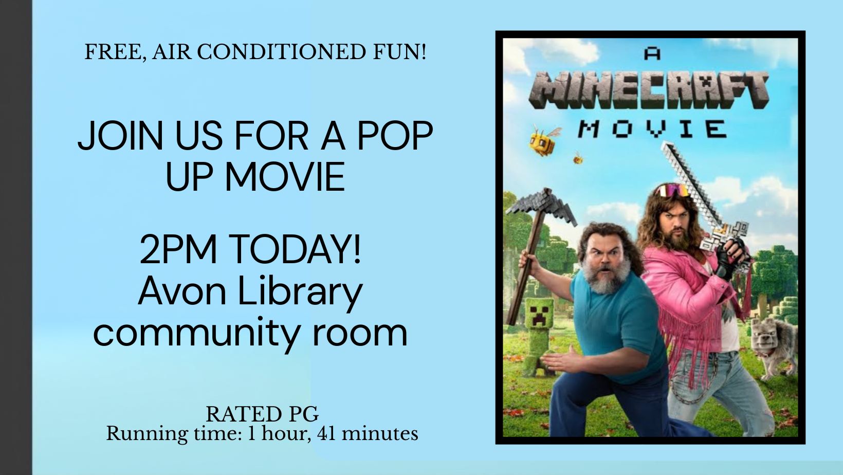 Join us at 2pm today for an air-conditioned viewing of MINECRAFT. Rated PG, all ages welcome.