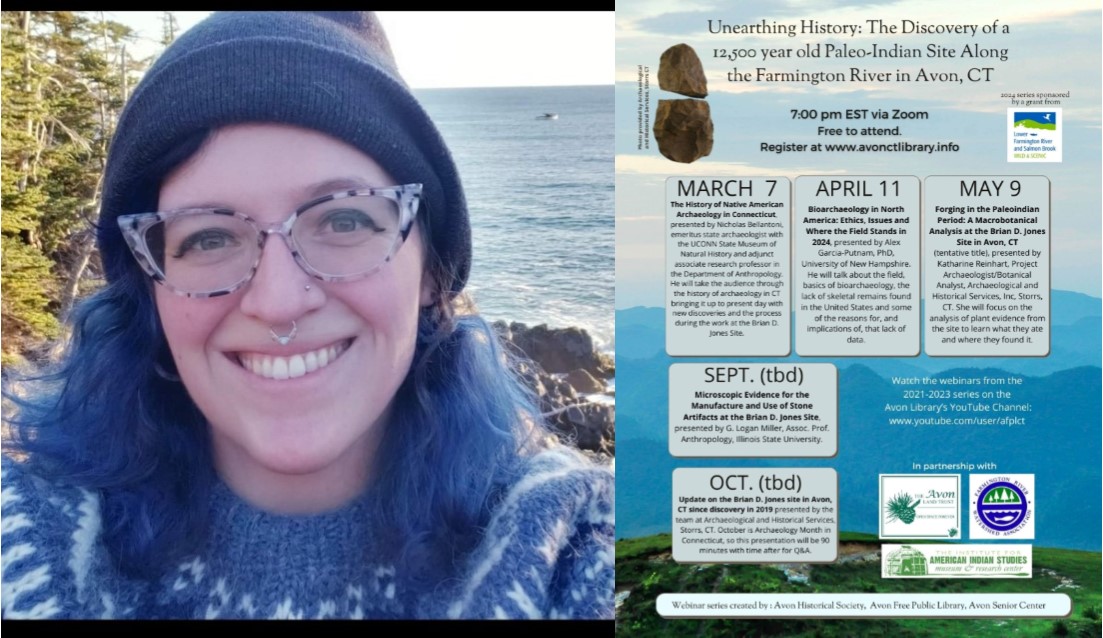 Foraging in the Paleoindian Period: A Macrobotanical Analysis (tentative title), presented Katharine Reinhart, Project Archaeologist/Botanical Analyst, Archaeological and Historical Services, Inc, Storrs, CT. She will focus on the analysis of plant evidence from various sites to learn what they ate and where they found it.