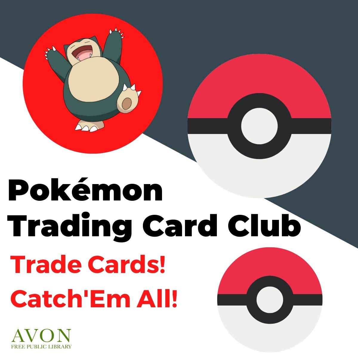 Venture into the exciting world of Pokémon! Bring cards to show off or trade. Join us on the second floor, Children’s department main floor for Pokémon Trading Card Club!