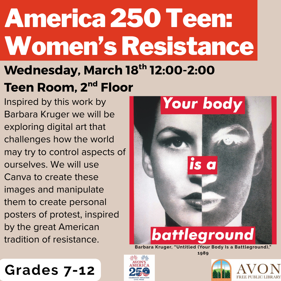 As part of the AFPL's America's 250th programming: Inspired by this work by Barbara Kruger we will be exploring digital art that challenges how the world may try to control aspects of ourselves. We will use Canva to create these images and manipulate them to create personal posters of protest, inspired by the great American […]