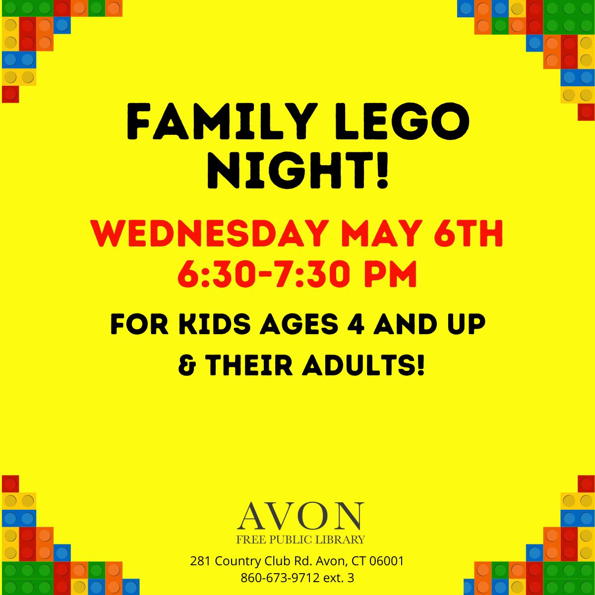 Children's Department Main Room 281 Country Club Road Connecticut, Avon, CT, United StatesFamily LEGO Night Wednesday May 6th 6:30-7:30 PM For kids ages 4 and up & their adults! Location: Children’s Department Main Floor All Legos will be provided by the library for family use during the program. Registration Required