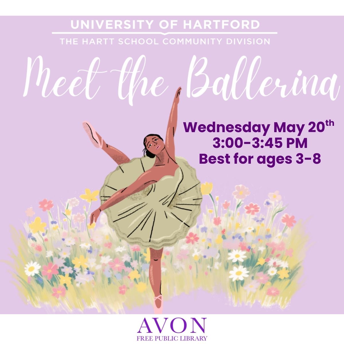 Community Room 281 Country Club Road Connecticut, Avon, CT, United StatesWednesday, May 20th, 3:00-3:45 PM Location: 1st floor Community Room Join us for a ballet lesson, a reading from a ballet book and meet a ballerina from the Hartt Dance School! This program is geared toward children ages 3-8 (siblings always welcome). Space is limited. Registration required.