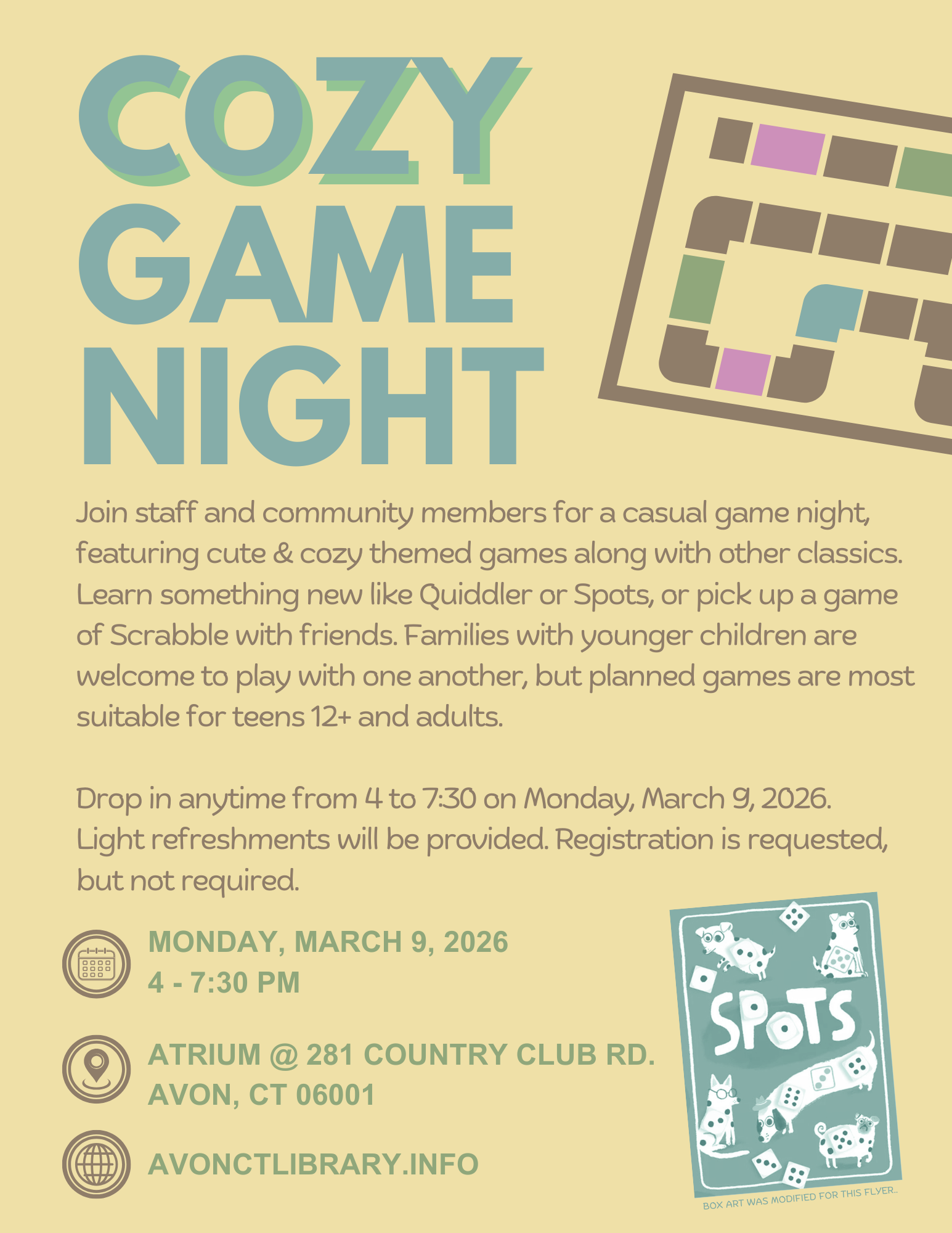 Atrium, First Floor Reference Area 281 Country Club Road Connecticut, Avon, CT, United States +1 moreJoin us for a casual game night, featuring cute & cozy themed games along with other classics. Registration is not required, but is requested so we can plan accordingly. Drop in the Atrium from 4:00 PM - 7:30 PM.