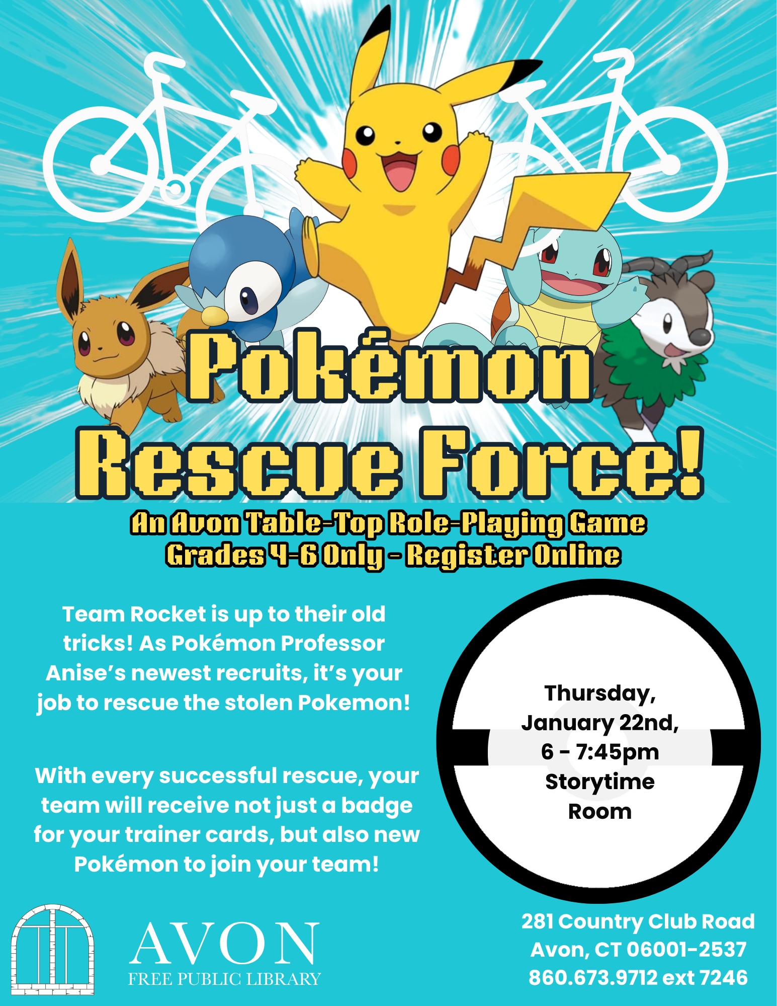 Children's Storytime Room 281 Country Club Road Connecticut, Avon, CT, United StatesChildren's ProgramsIt’s time to be a Pokémon hero! Avon Free Public Library presents Pokémon Rescue Force! You are Pokémon Professor Anise’s newest recruits at Pokémon Rescue Force! Alongside your partner Pokémon, your mission is to keep safe the Pokémon of the world. That dreadful Team Rocket has other ideas, however, so when they kidnap Pokémon from […]